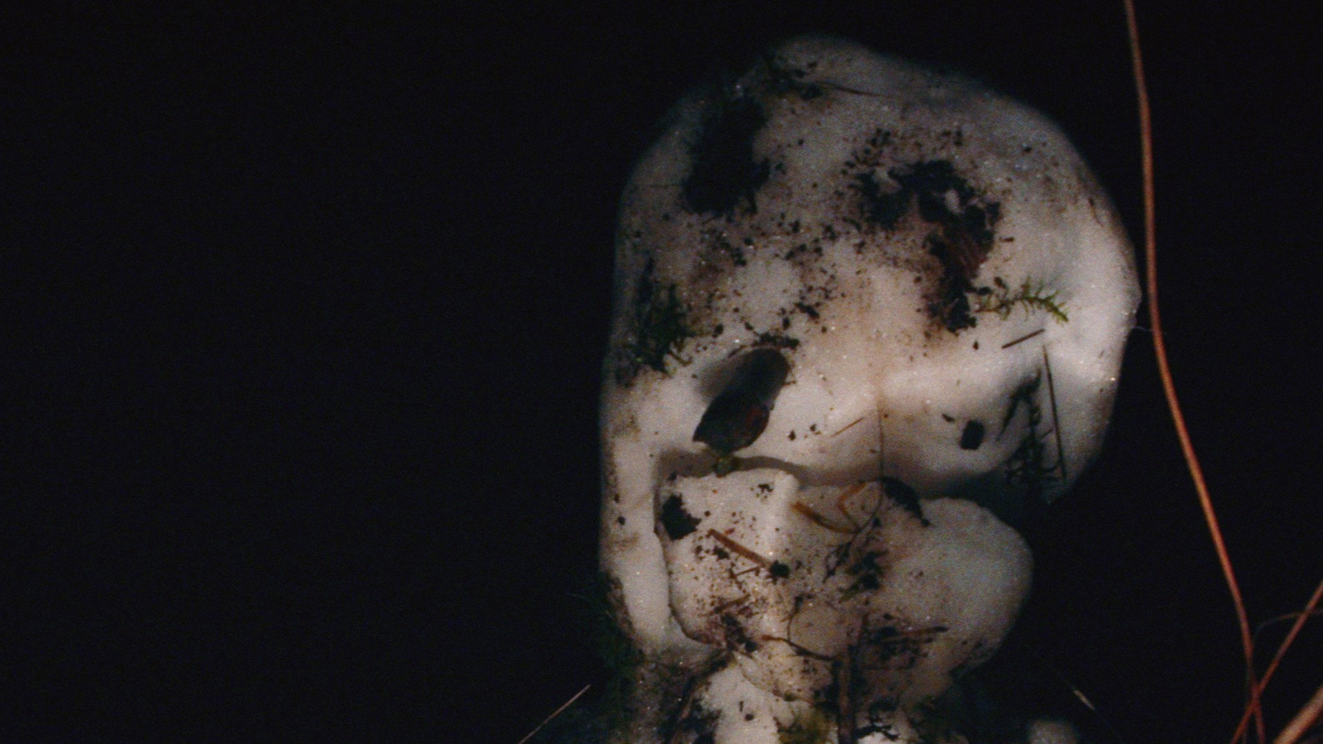 A snowman approaches in the night.