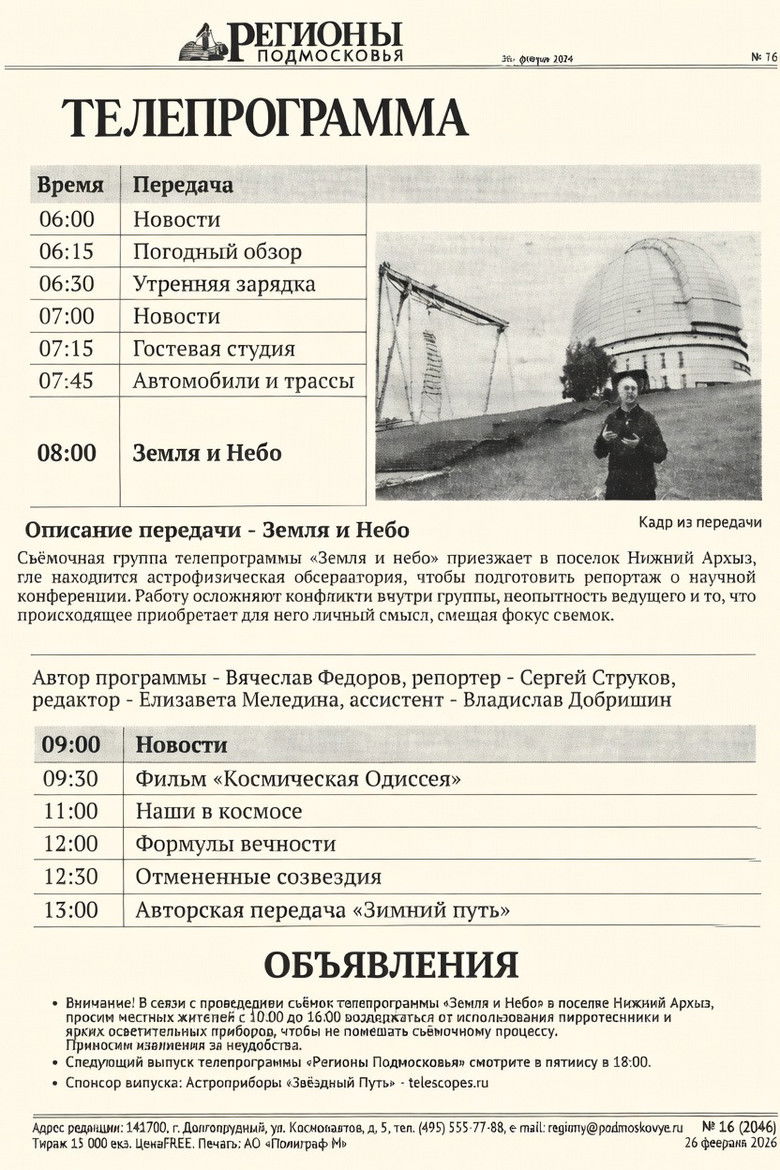 The film crew of the TV program “Earth and Sky” arrives in the village of Nizhny Arkhyz, home to an astrophysical observatory, to prepare a report on a scientific conference. Their work is complicated by conflicts within the team, the host’s inexperience, and the fact that the events unexpectedly take on personal significance for him, shifting the focus of the shoot.