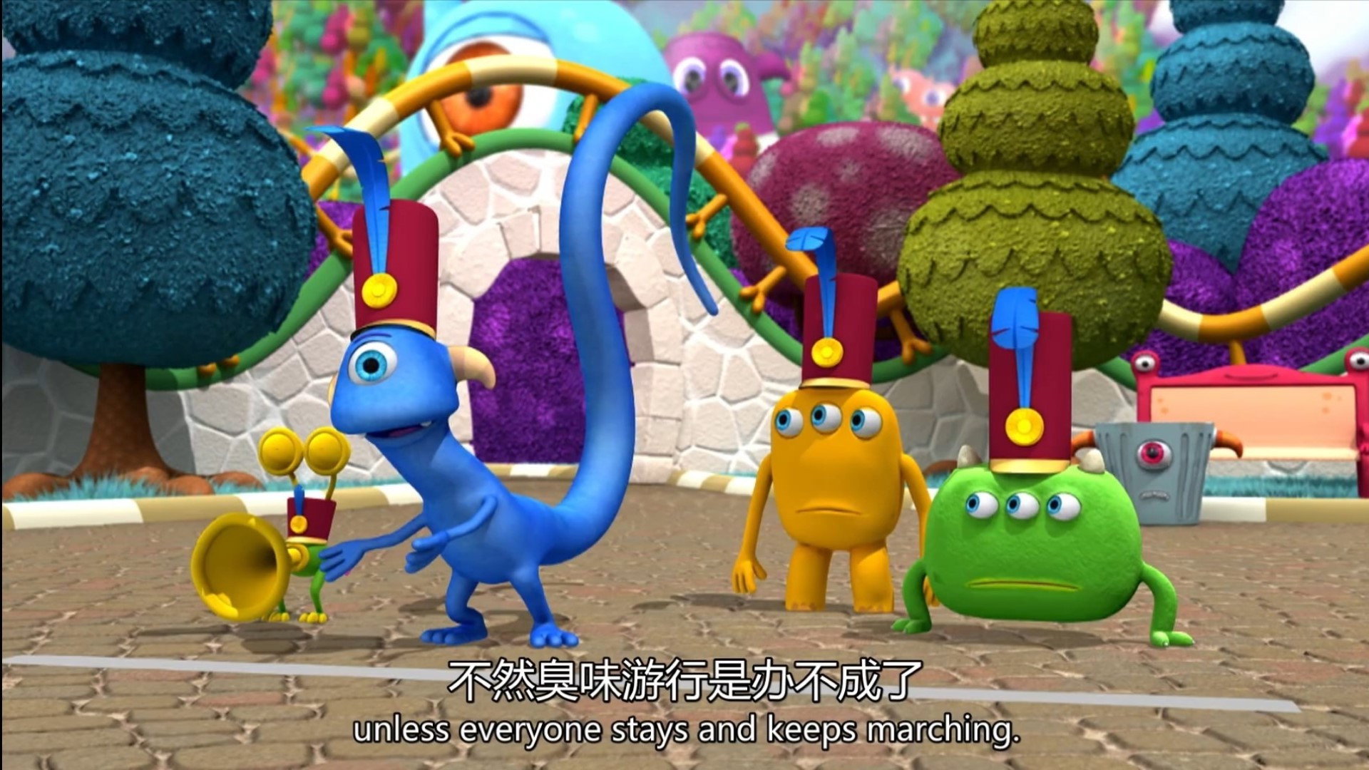 Long Tail Monster is trying to lead the Monster Stinkiness Parade, but whenever he starts marching all the other monsters suddenly disappear!