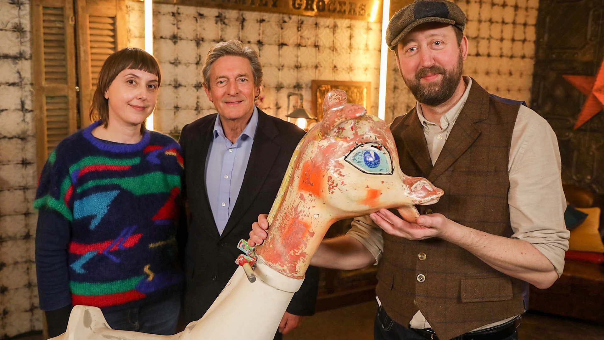 Five dealers bid against each other to buy a model giraffe, a snuff box and a set of Matchbox cars.