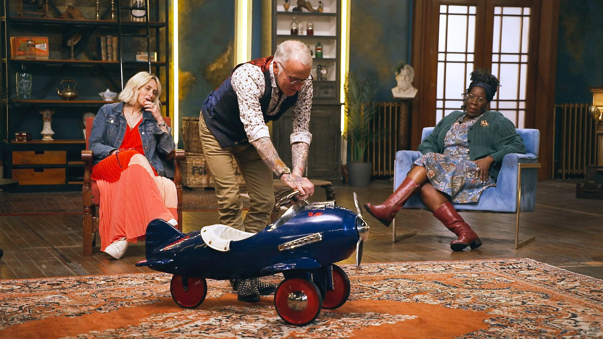 Nigel Havers presides as five sellers aim to get the best price for their items, including a trunk, a magic lantern, a ride-on toy aeroplane, a corkscrew and some nursery posters.