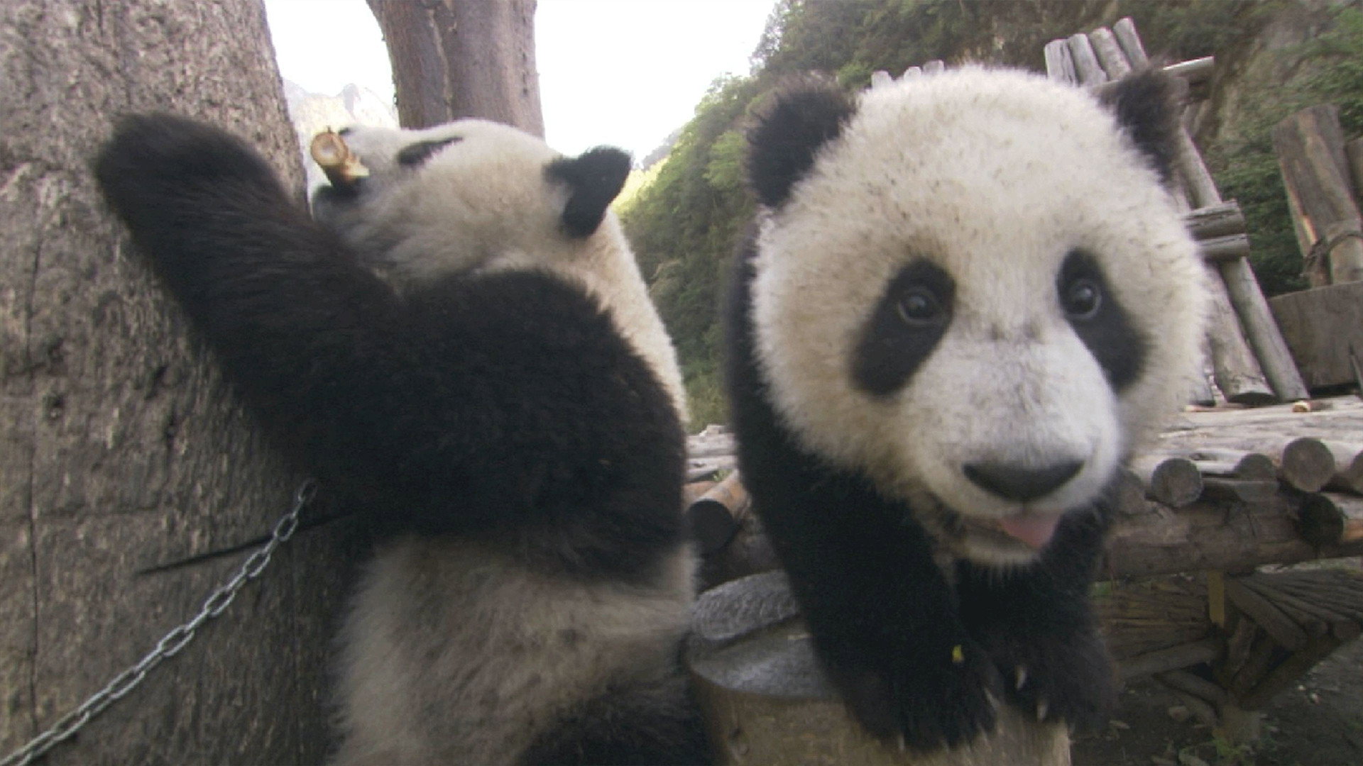 The fun never ends when two panda friends goof off together in this video.