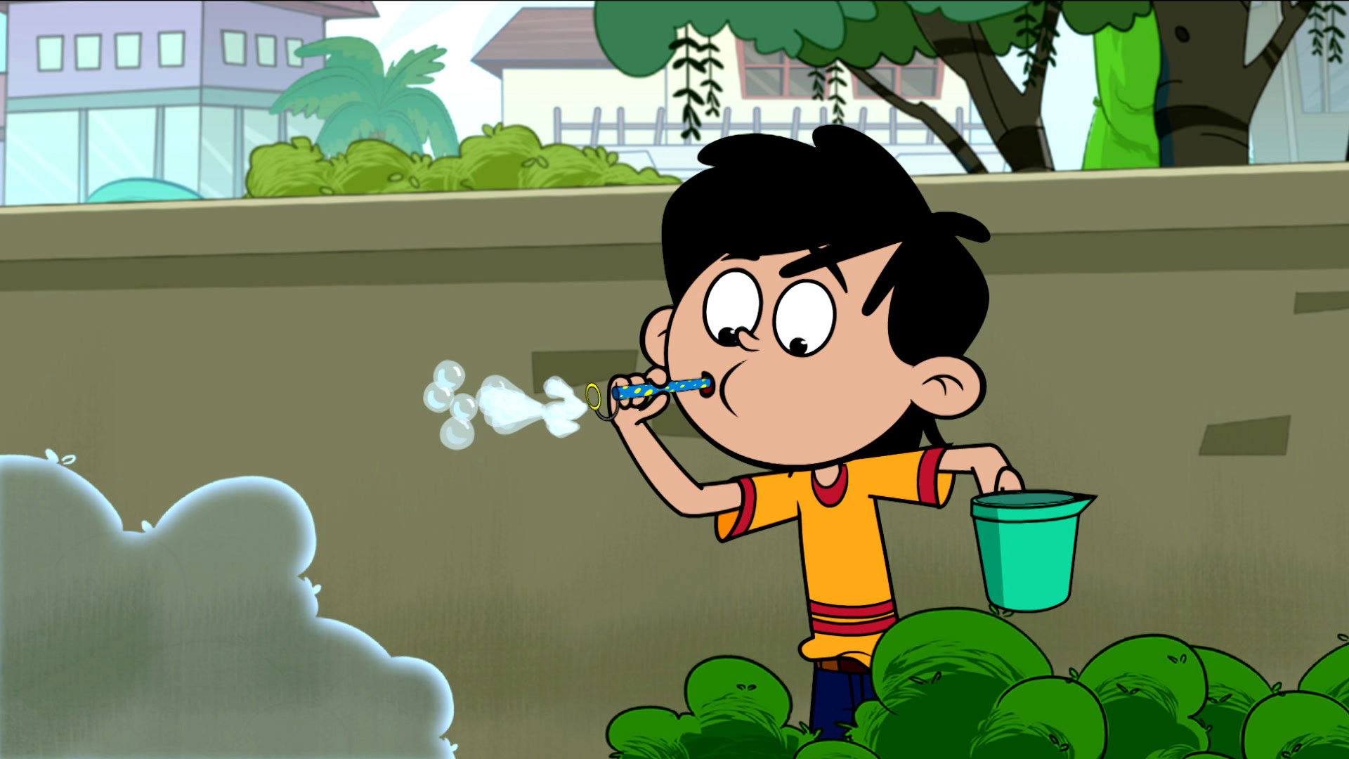 To get rid of the ink stain from the bedsheet Golu provides Adi with magical washing powder.