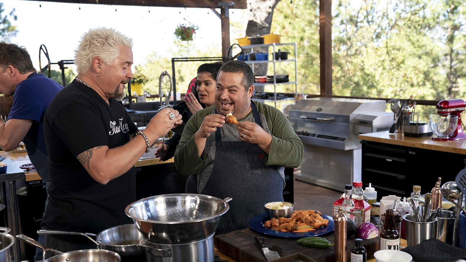 An all-star lineup of chefs cook game day grub in Guy's ranch kitchen.