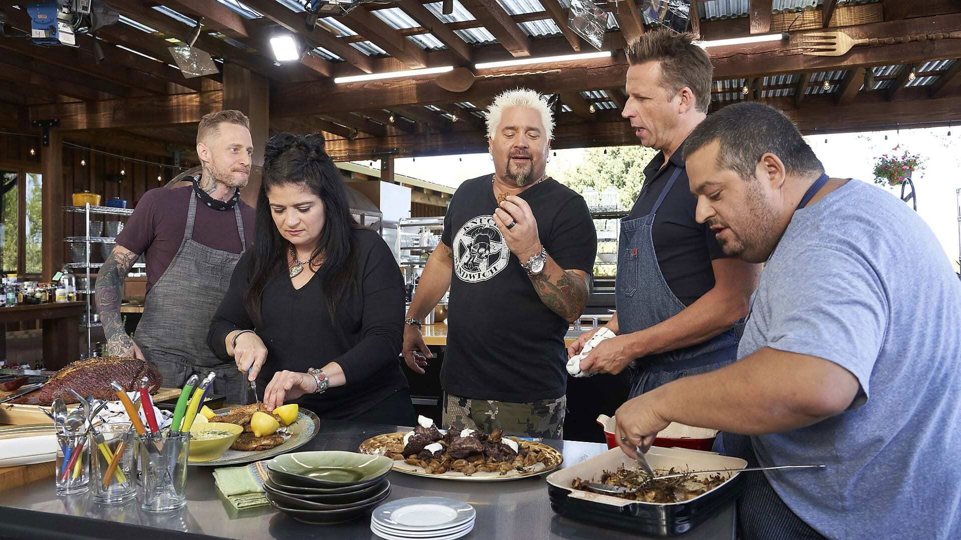 Guy invites chef friends to share their old-fashioned Sunday supper recipes; Alex Guarnaschelli prepares a pitcher of lemony Negronis and cooks black pepper-crusted roast beef and gravy served with sauteed spinach with pancetta and crispy garlic.
