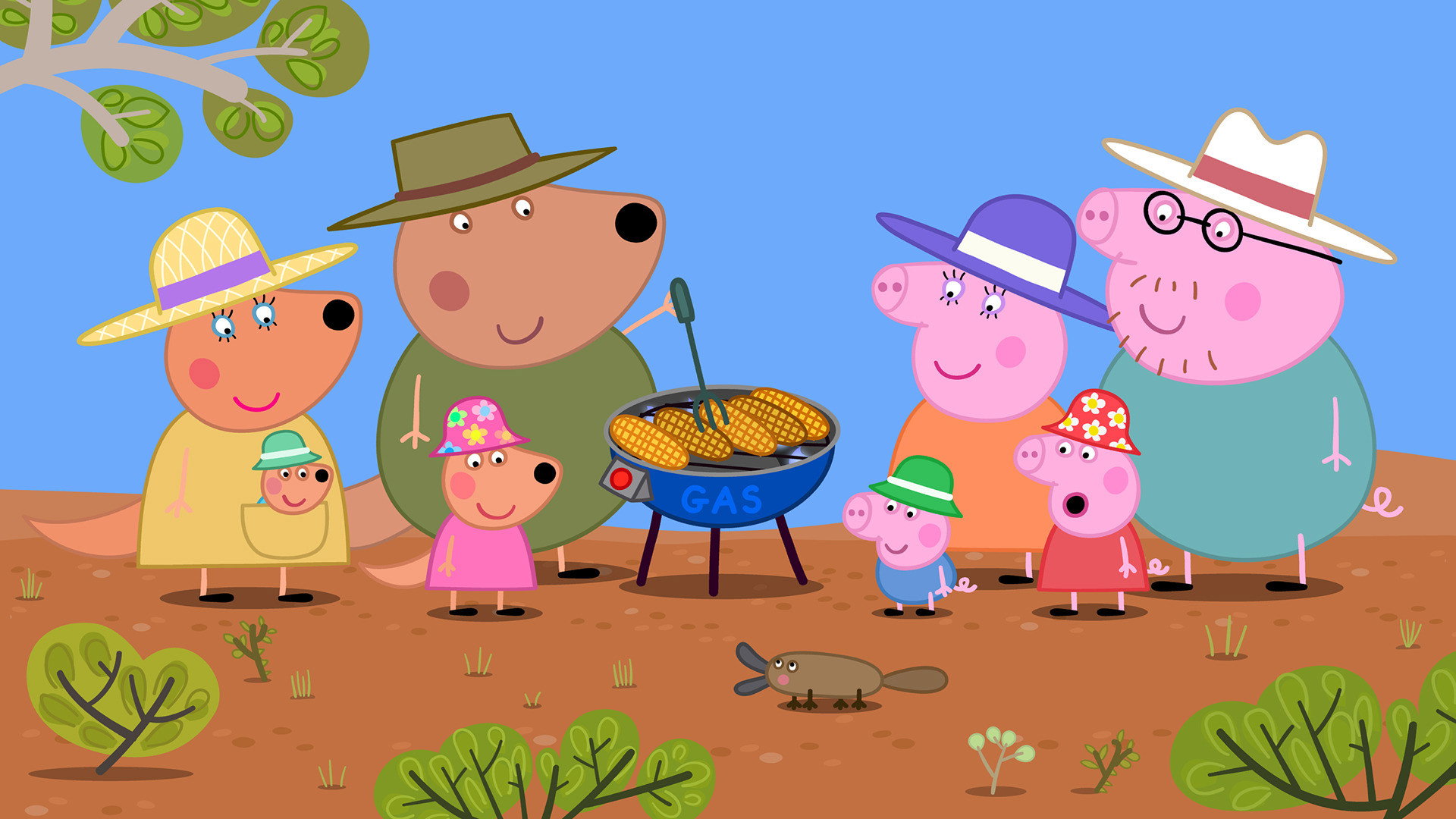 Peppa, George, Mummy Pig and Daddy Pig embark on their first ever Australian holiday. They are visiting the Kangaroo family, who take them to explore the Outback on their first day.
