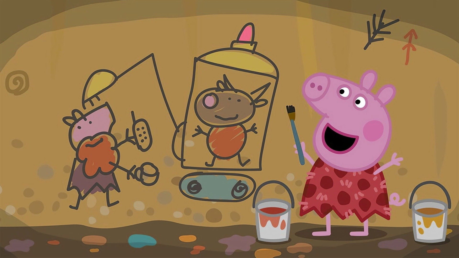 Granny and her friends' historical re-enactment society are being cave people today. Peppa and George join in helping to catch Grandpa Pig who is dressed as a woolly mammoth.
