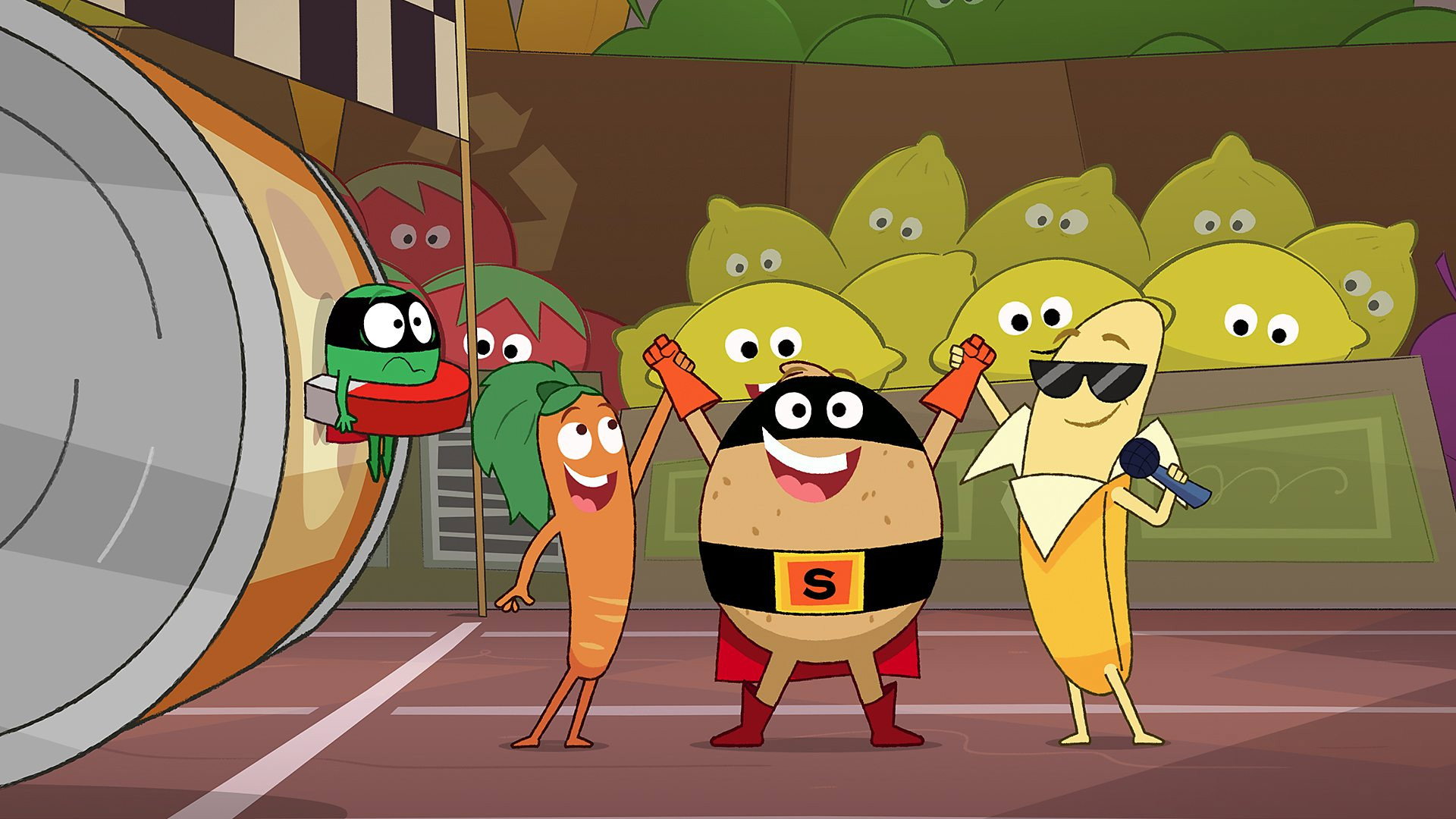 It’s the Tin Can Games and Evil Pea wants to win the Tin Can Trophy. She cheats in the final race by putting a magnet on Supertato’s back to stop him from going super fast.