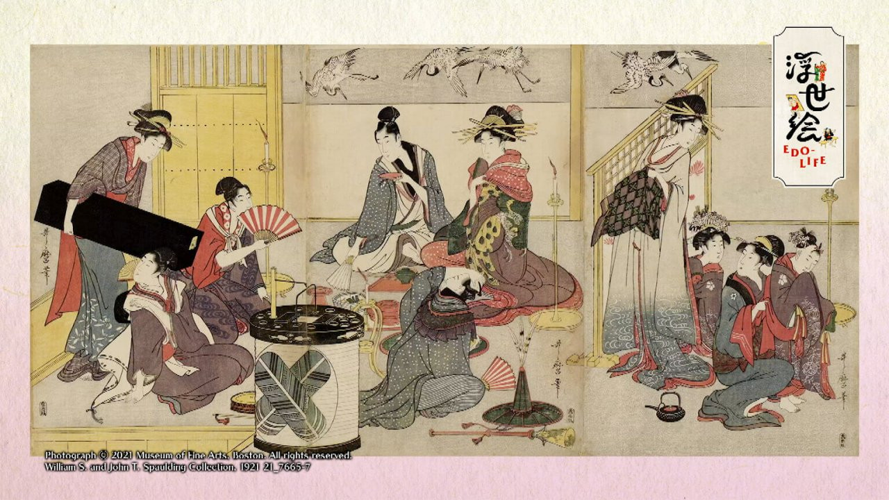 In the pleasure quarter of Yoshiwara, a high-ranking courtesan tends to a patron, while a jester attempts to entertain with an eccentric costume -- hinting at the Edo townspeople's affinity for cosplay.