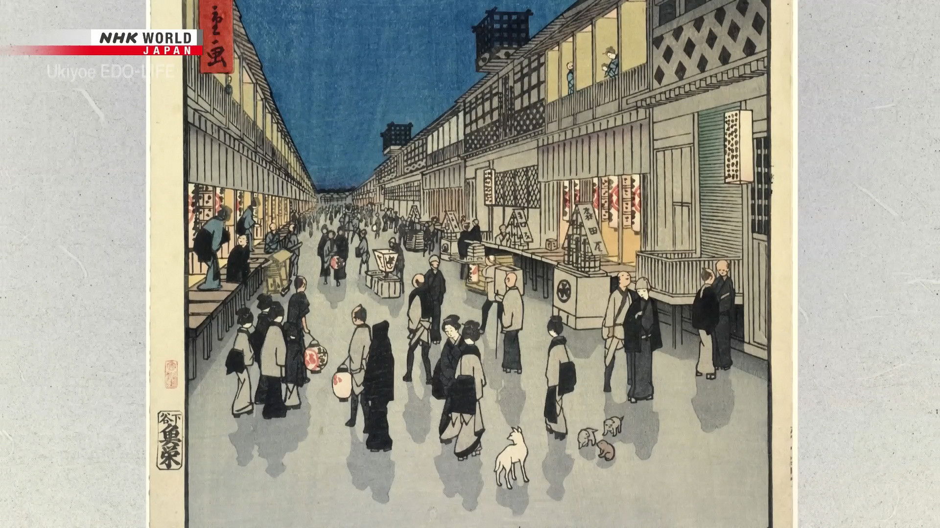 A full moon shines above a bustling neighborhood. Featured prominently are kabuki theaters...on hiatus. Still, people have come out to take in the nightlife, and hopefully a celebrity sighting or two.