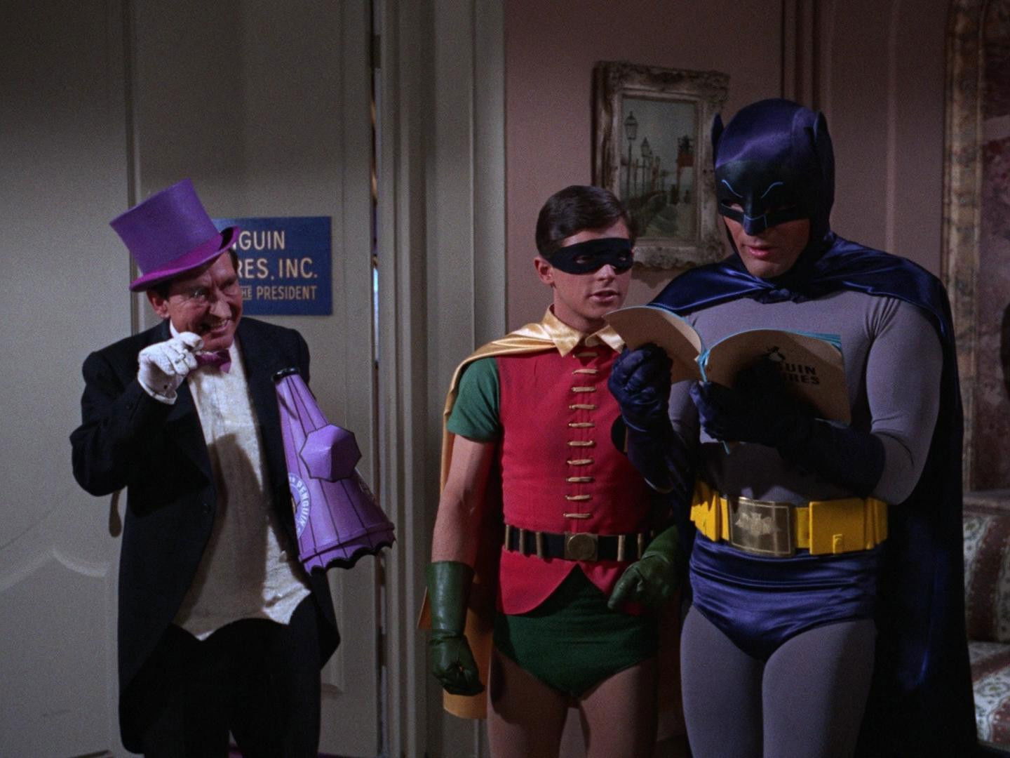 In order to keep a close eye on the Penguin (and hopefully locate the stolen chain mail armor), Batman and Robin rejoin Penguin's movie efforts. The next part of his film is to take place in medieval times. Therefore, Penguin has the Dynamic Duo dress in armor suits, but only to trap them with a giant magnet while he snatches top-secret papers from the Hexagon. Batman and Robin free themselves and follow the villain, but after a losing battle with him, the Penguin has them hauled off as scrap metal to be crushed.