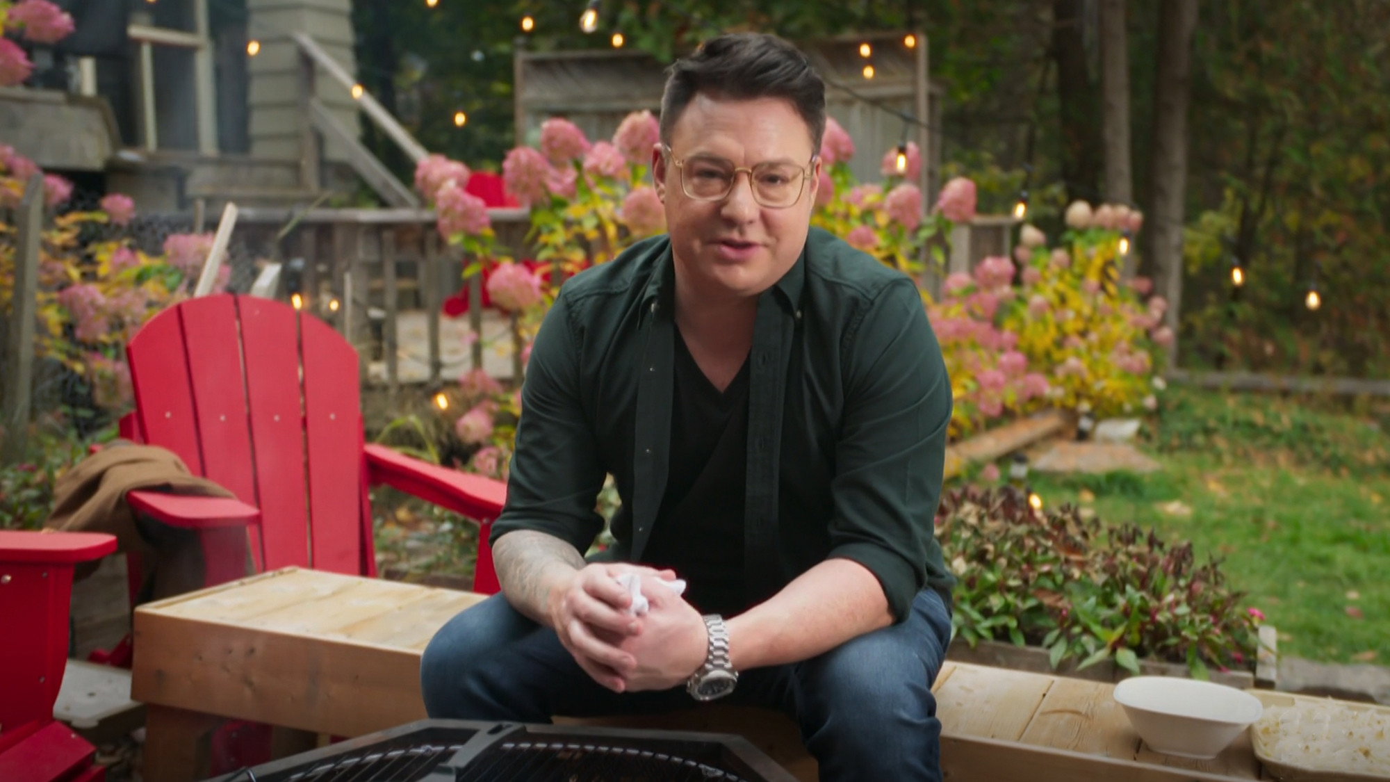 Spencer Watts sets a fire outdoors and prepares campfire steaks with nori butter, an open-faced Montreal smoked meat potato rosti, and a sweet and creamy chocolate and cherry liqueur fondue with treats.