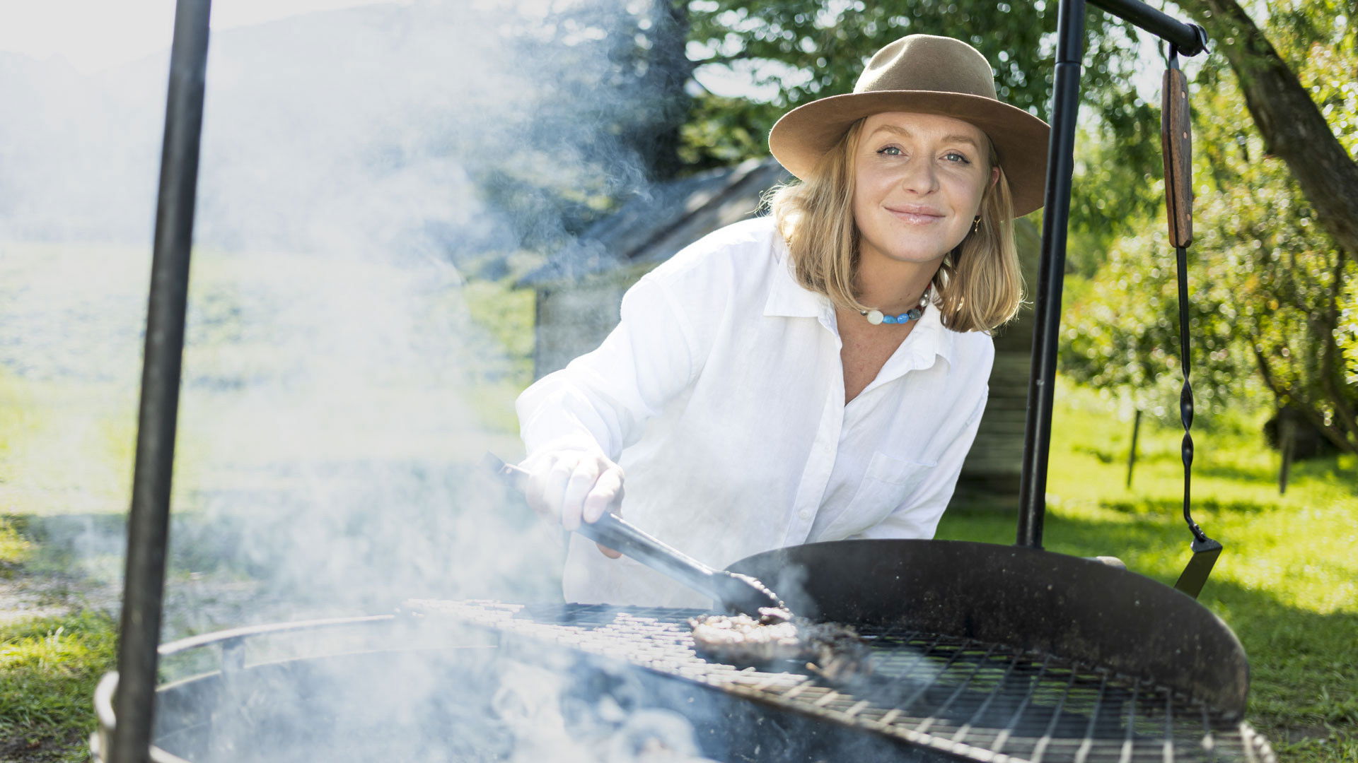 Annie Starke and her mom, Glenn Close, are throwing a birthday bash for her aunt on their ranch with grilled sweet sausage, campfire greens with ham hock, summer salad with fresh corn dressing and shortcut cake and an incredible table set by Glenn.