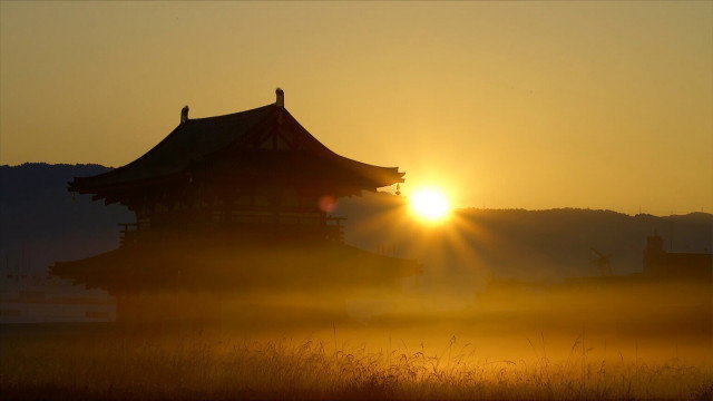 Before daybreak at the Nara Palace Site, frost forms on the vast field where ears of Japanese silver grass have begun to stand out. The edge of the distant mountains begins to whiten, and the light shines suddenly. It's sunrise. The Suzaku-mon Gate's silhouette emerges in the sunlight. When the orange sun rises from behind the mountains and spreads into a round shape, the frost melts to become transparent beads, covering the wild chrysanthemums' petals. It's the beginning of a new day. *According to the 24 Solar Terms of Reiwa 3 (2021), Soukou is from October 23 to November 7.