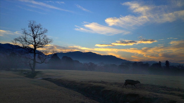 It is the Heavy Snow of the 24 Solar Terms. The morning service at Kohfukuji Temple begins while it's still pitch dark outside. As the sky grows lighter, its hue changes every second. Although it is both blue and red, how does a great writer describe such delicate colors at the break of dawn? At Tobihino, the deer that cannot wait for the morning have already started their day.