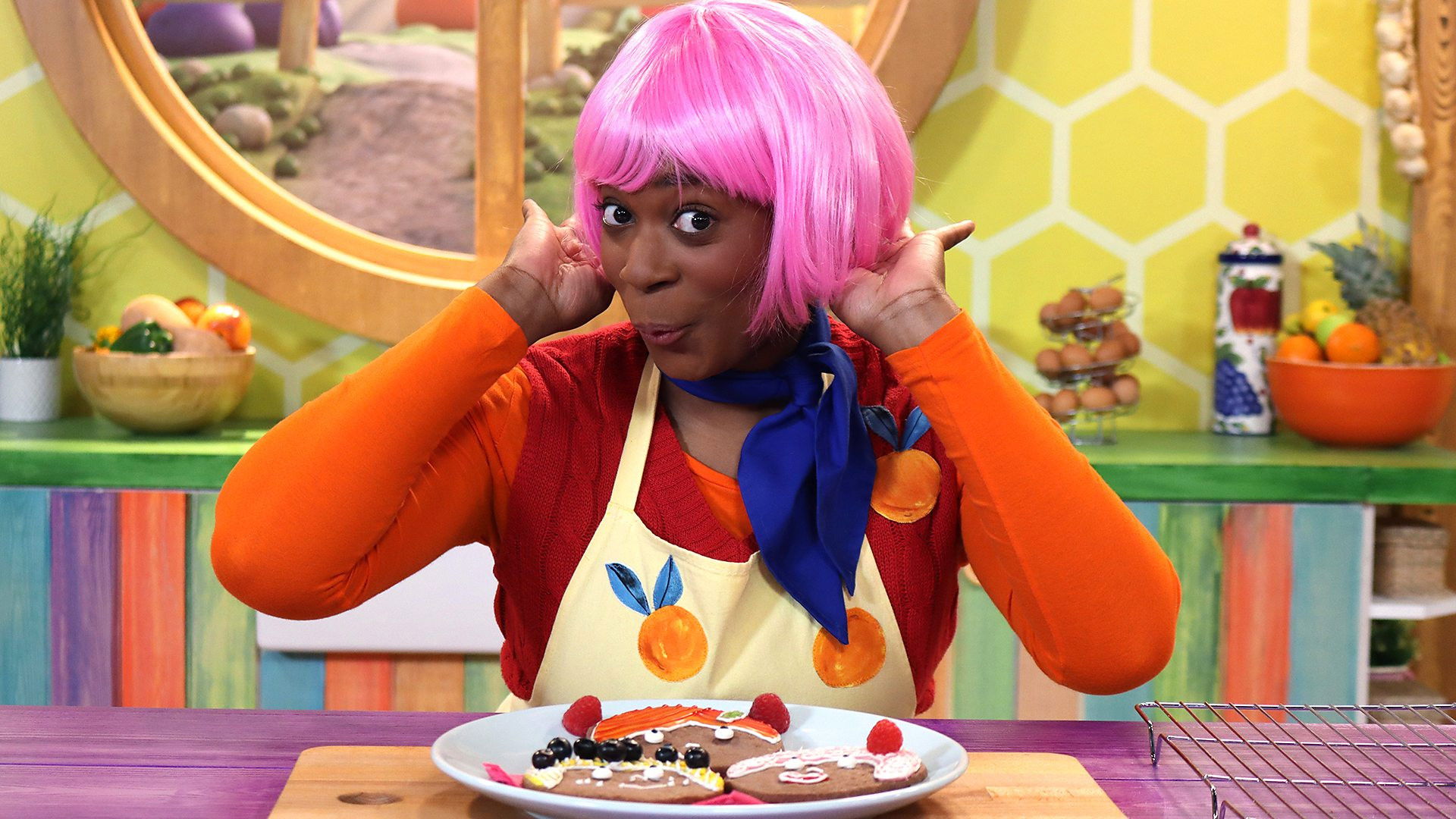 Jen has brought in a bag of wigs, but she needs a mirror to see what she looks like. Hassina the hairdresser comes to visit, Small flies on her magic spoon to find out how biscuits are iced, and they make hairdo cookies for their fancy friend.