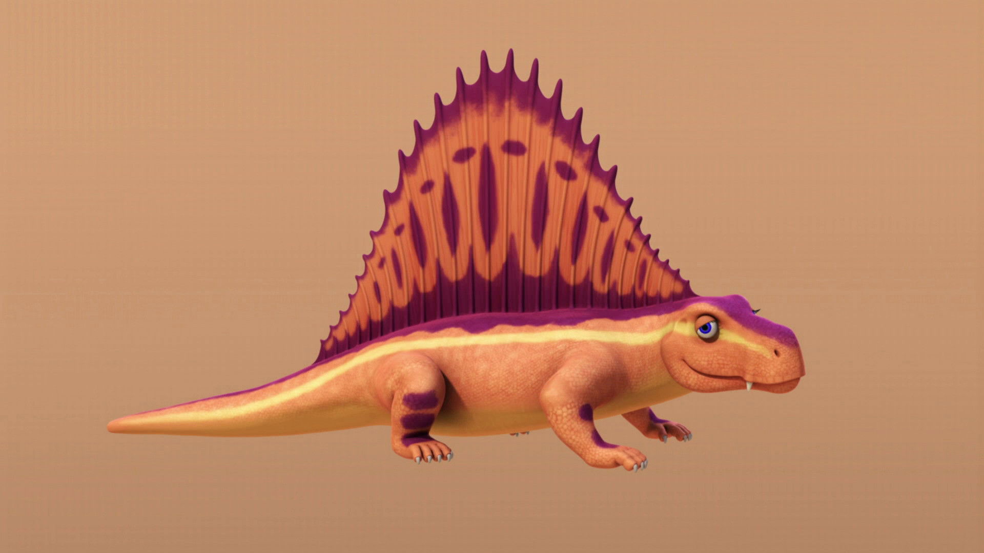 Buddy and Tiny start wondering aloud whether the Triassic was the beginning of time, and if there was anything before the Age of Dinosaurs. So, to the Dinosaur Train they go where Mr. Conductor takes them back to the beginning of the Triassic time period to get some answers. In the Triassic, Buddy, Tiny, Mom, and Mr. Conductor meet up with Erma Eoraptor who is happy to explore the “before the Triassic” question with them. Our group walks through a Pedestrian Time Tunnel (that’s beyond the end of the train tracks) to get to the Permian Time Period, the time period immediately before the Triassic. There, they meet Deon Dimetrodon, who has never met a dinosaur or pterosaur before. Buddy and Tiny are amazed to learn that there are neither in the Permian (or earlier)! Deon marvels at our family’s features – especially Tiny and Mrs. Pteranodon’s wings. Deon shows our group around the hot and humid Permian, and he explains how his sail fin keeps him cool. Then Deon is delighted to experience the Mesozioc Era. He walks through the Pedestrian Time Tunnel with our group, and is blown away by the vegetation and the variety and size of dinosaurs. Another lifelong friendship is forged!