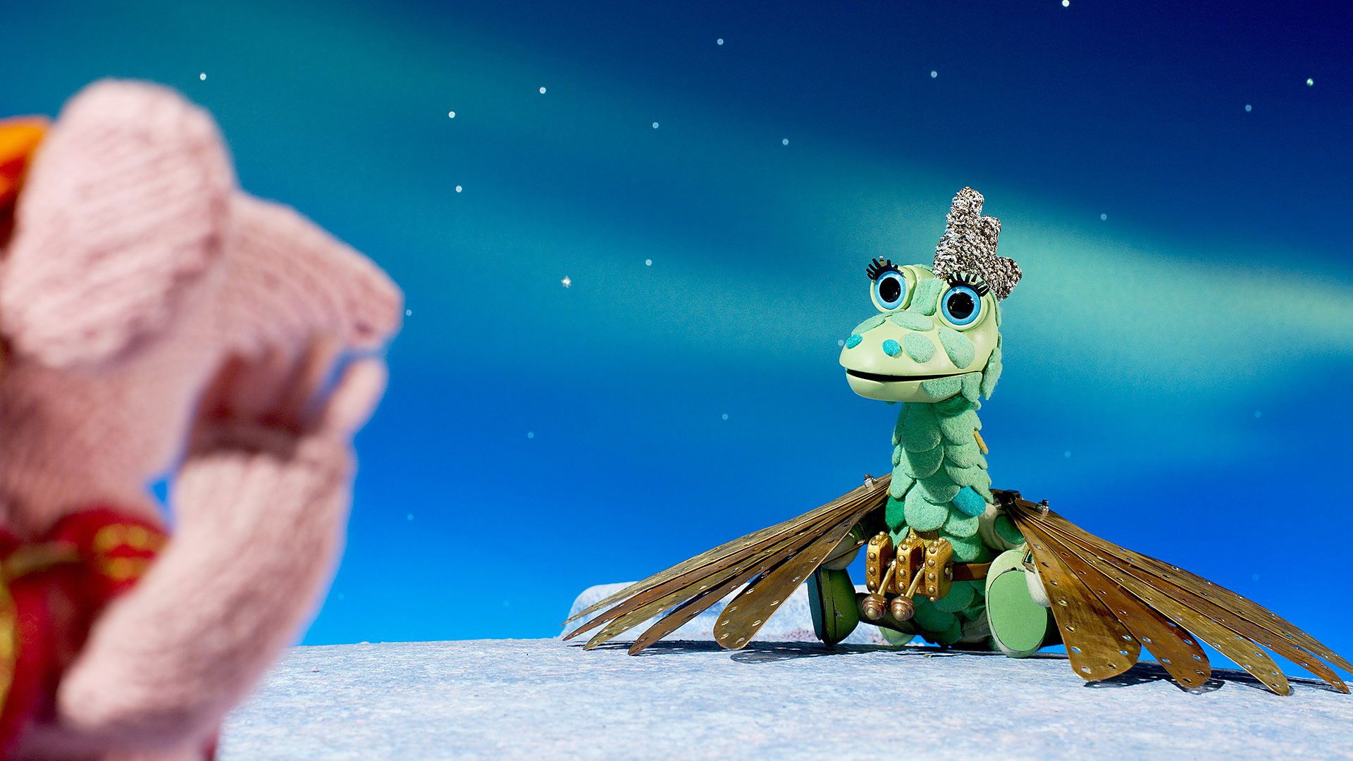 The Soup Dragon cheers Tiny up when the Iron Chicken goes away on a trip.