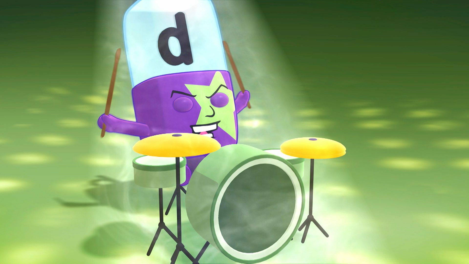 D is ready to rock - he has his drumsticks but nothing to bang on. With a little help from his friends, he tries a pan and a pin. But how can he deliver his dazzling drum solo? This episode introduces the letter D and the words 'sat', 'pad', 'pan', 'pin', 'tap' and 'din'.