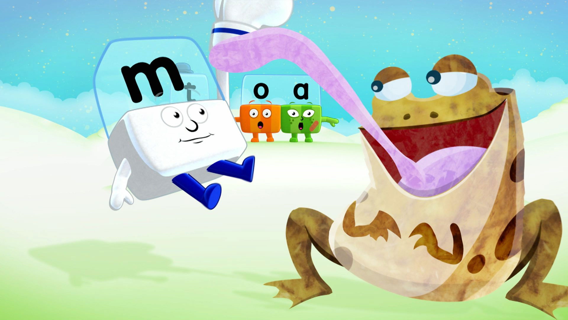M can't resist munching everything in sight until a giant toad appears. Suddenly he is not the biggest eater around! This episode introduces the '-oa-' digraph and the words toad, coat, coal, goal, goat, moat, loaf and toast.