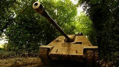 The comedian meets a German tank crew in the Ardennes. The comedian climbs into the cockpit of one of their machines, similar to the ones used in the Battle of the Bulge.