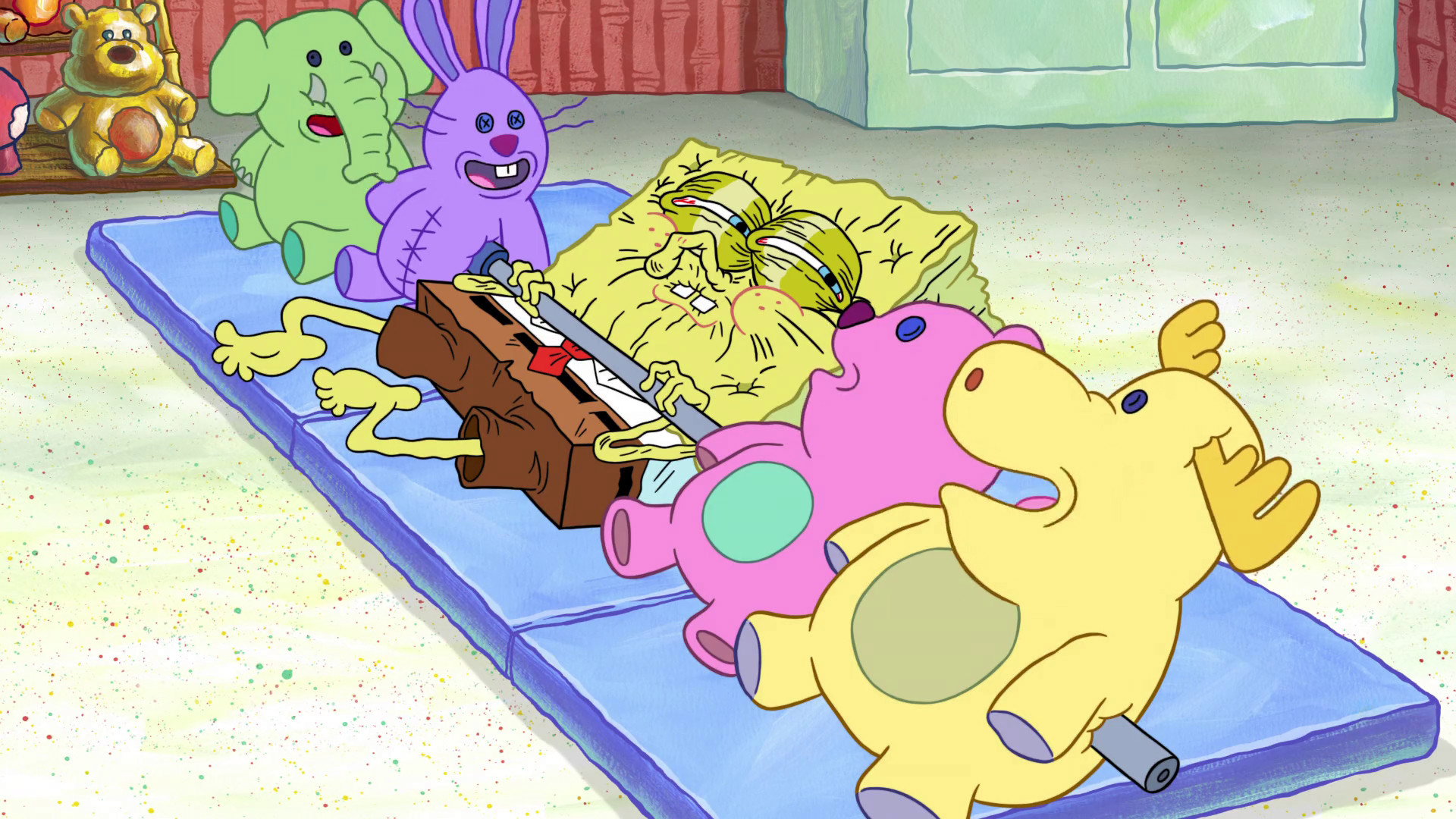 SpongeBob accidentally gets pinned under his exercise equipment and must wait for help to arrive.