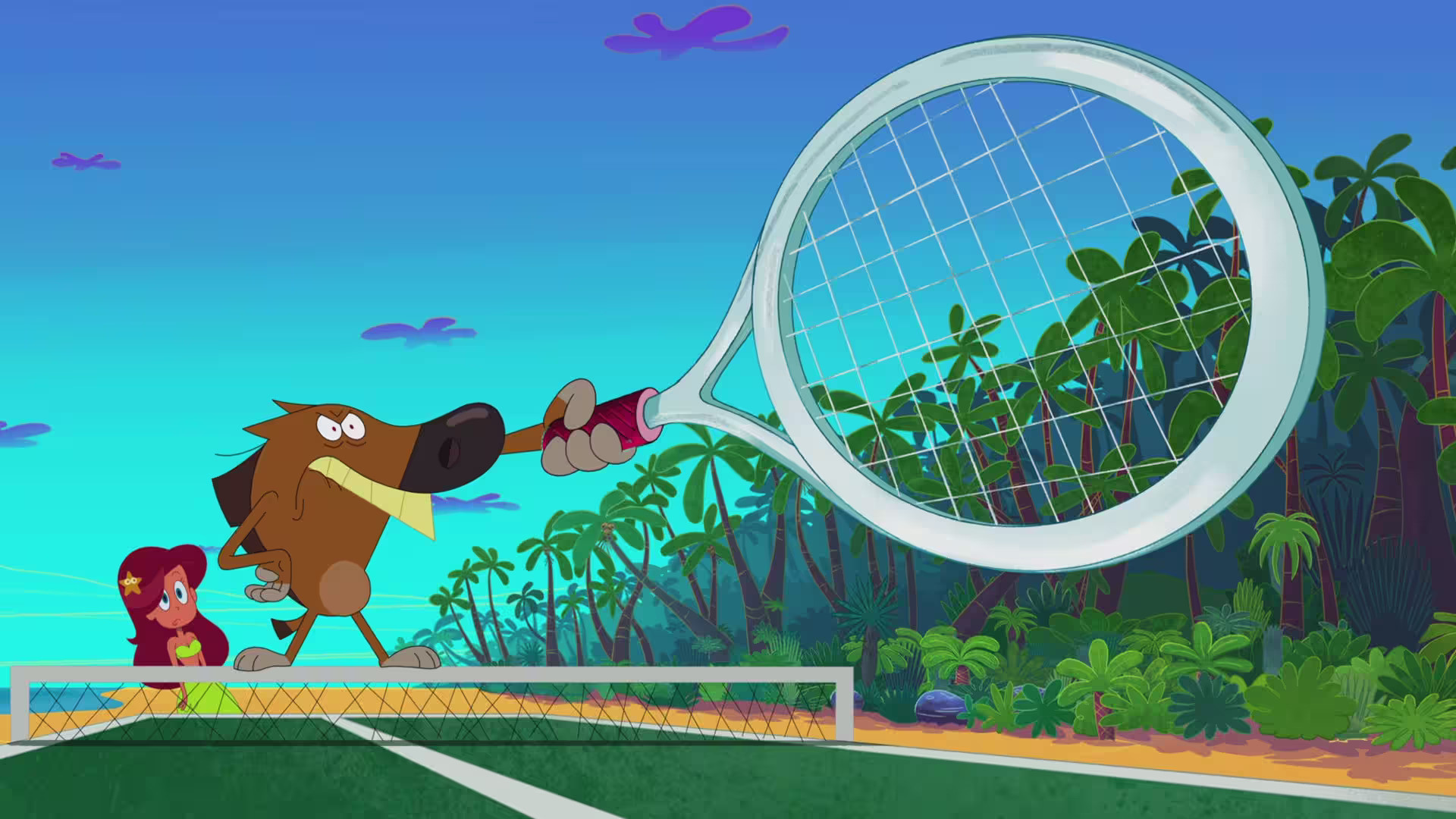 After Sharko defeats Marina at ping-pong, Zig challenges him to a crooked game of tennis, as a ploy to catch her.