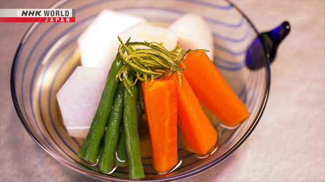 Chef Saito continues to teach us about traditional Japanese kaiseki set course meals. The fifth course is a simmered dish. Learn the art of simmering vegetables to bring out their inherent flavor.