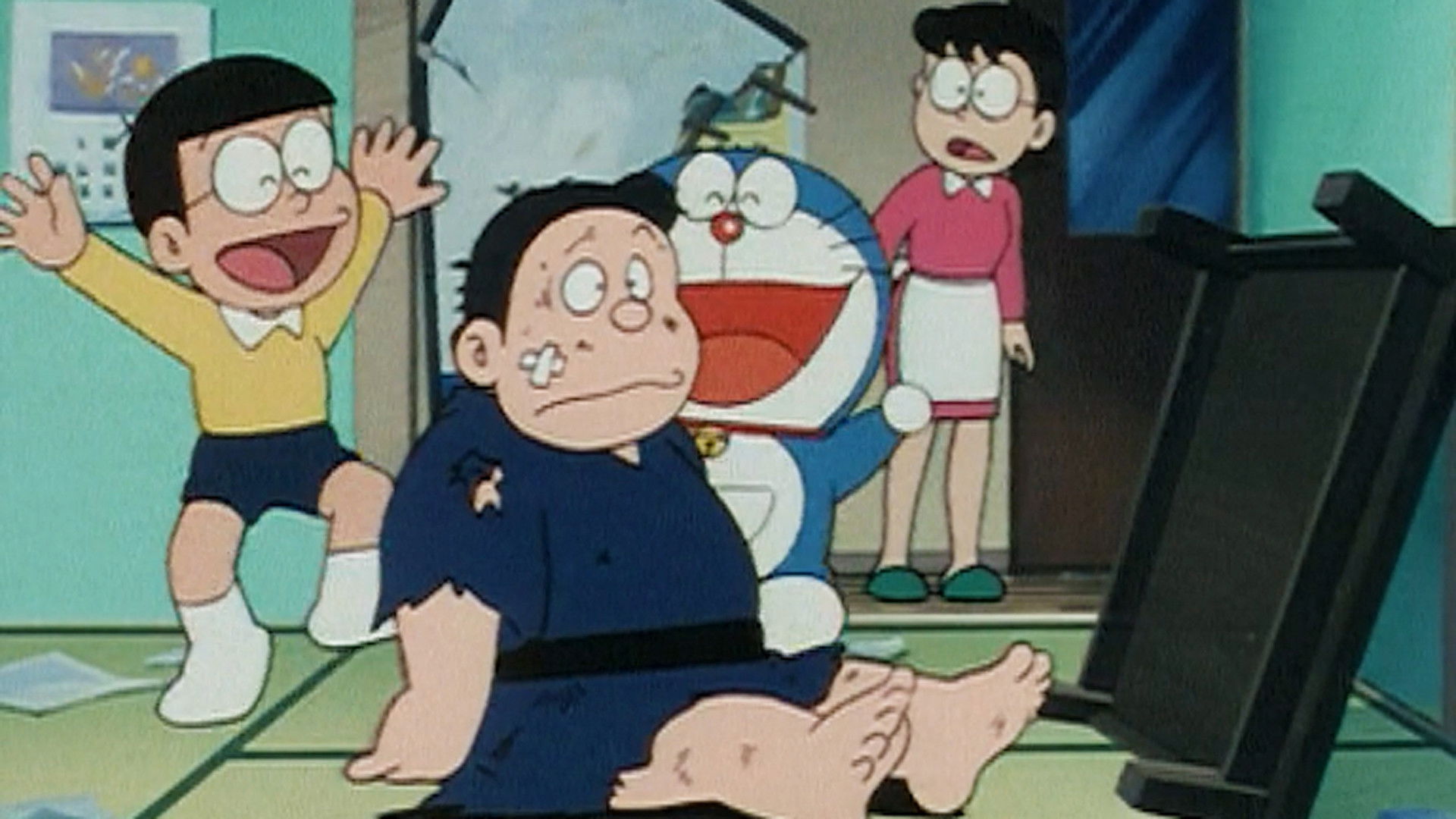 When Nobisuke comes down with the hiccups, Nobita and Doraemon use a Time Bomb Sticker to frighten him and make his hiccups go away. They later use the sticker to scare Gian, but things go haywire when Suneo takes the sticker and gives it to Shizuka.