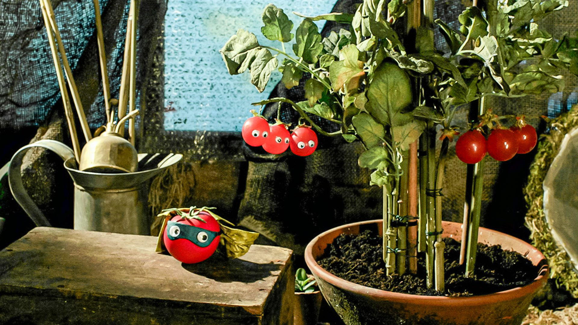 Stunt Tomato tries his latest death-defying balance trick.
