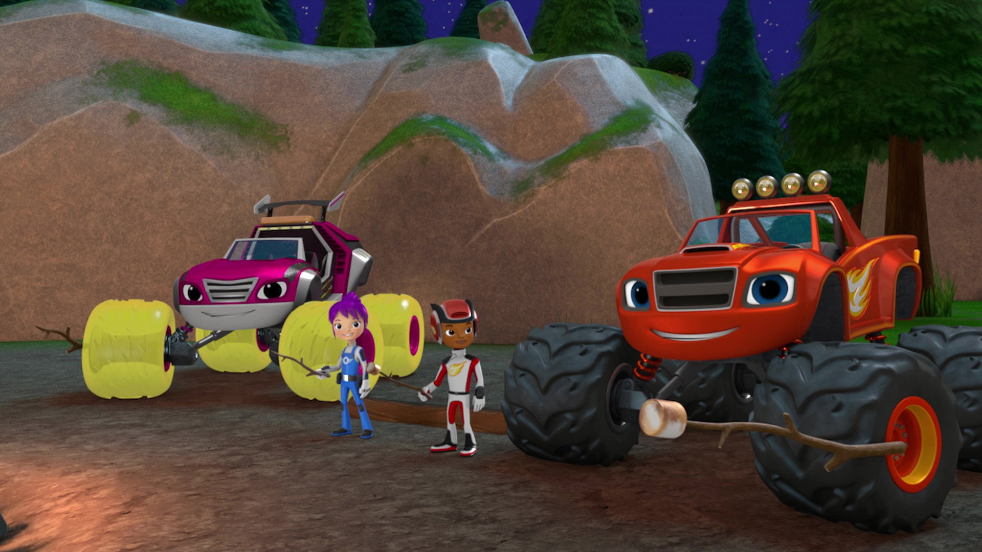 It's a campout under the stars! Blaze, AJ, Watts, Gabby, Crusher, and Pickle are gathered around the campfire to tell the most amazing stories they can make up! And the best part? Whoever tells the best story wins the last marshmallow!