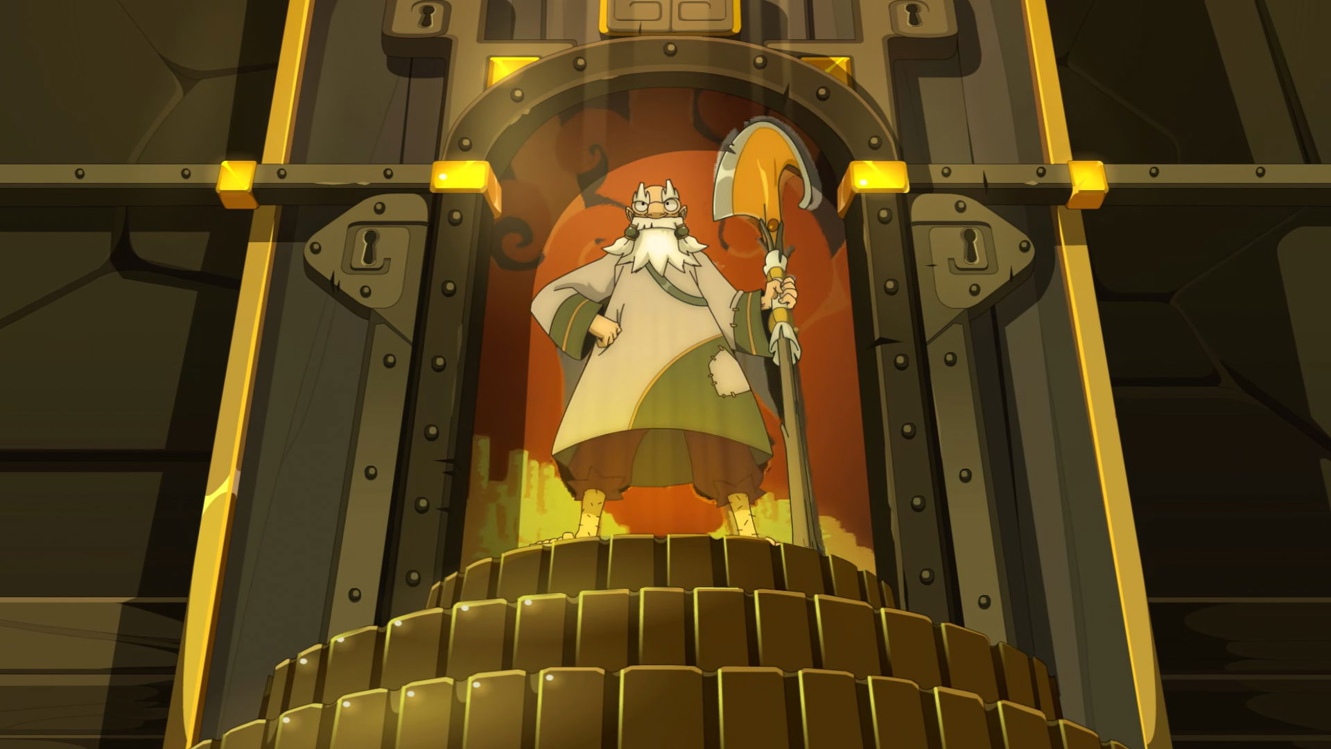 The group is staying at Xav's place, and getting some tips on how to deal with Grufon from its original master, Gonnard the Great. A traveling herald passes though and tells the group that kamas (gold coins) are being stolen throughout the land. Ruel, afraid his own Kamas will be stolen, retreats into his magical bag, and uses a recall potion to return home. The others, Gonnard included, follow after him. They discover his home is built into a clay mesa and has a special code to keep intruders out and keep his stash of Kamas hidden. Gonnard reveals himself to be a shapeshifting genie that turns into whatever he eats, and as he eats kamas, he's as hard as gold. He overpowers the group and eats more kamas. Ruel, not one to give up his kamas, tricks him into eating chocolate coins instead. Gonnard eats them and turns into chocolate. Ruel traps him inside a glass vase and leaves Gonnard in his vault.
