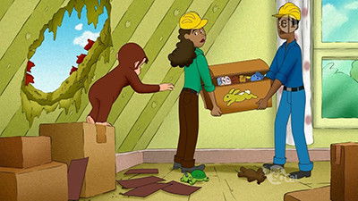 A hole in the roof means George and the Man with the Yellow Hat must sleep in the living room while their bedrooms are being repaired. But their adventure quickly turns into a disaster when George's nightly trips to the kitchen keep the Man awake at night.