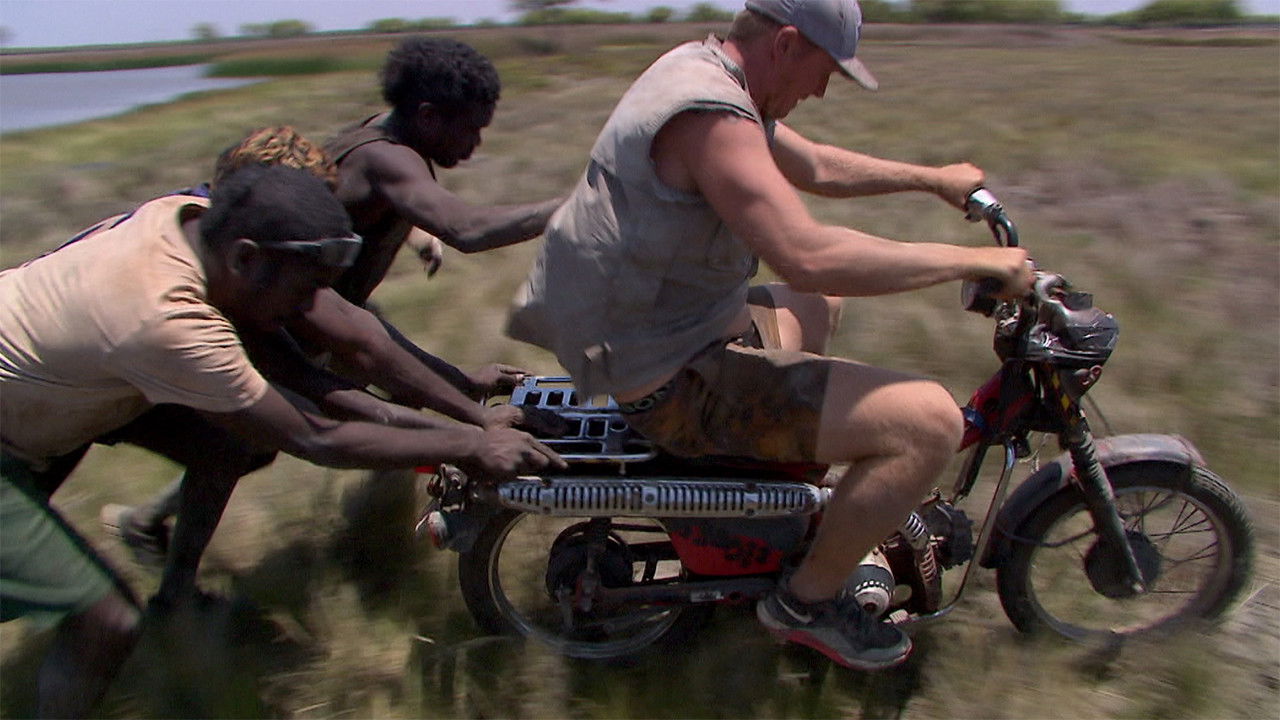 Chico and Dino ride behind the tractor but court disaster when it's torn to bits in a gully. Once again crowded onto the tractor, they are stopped by a croc-infested billabong. Joe sparks up the postie to test the depth.