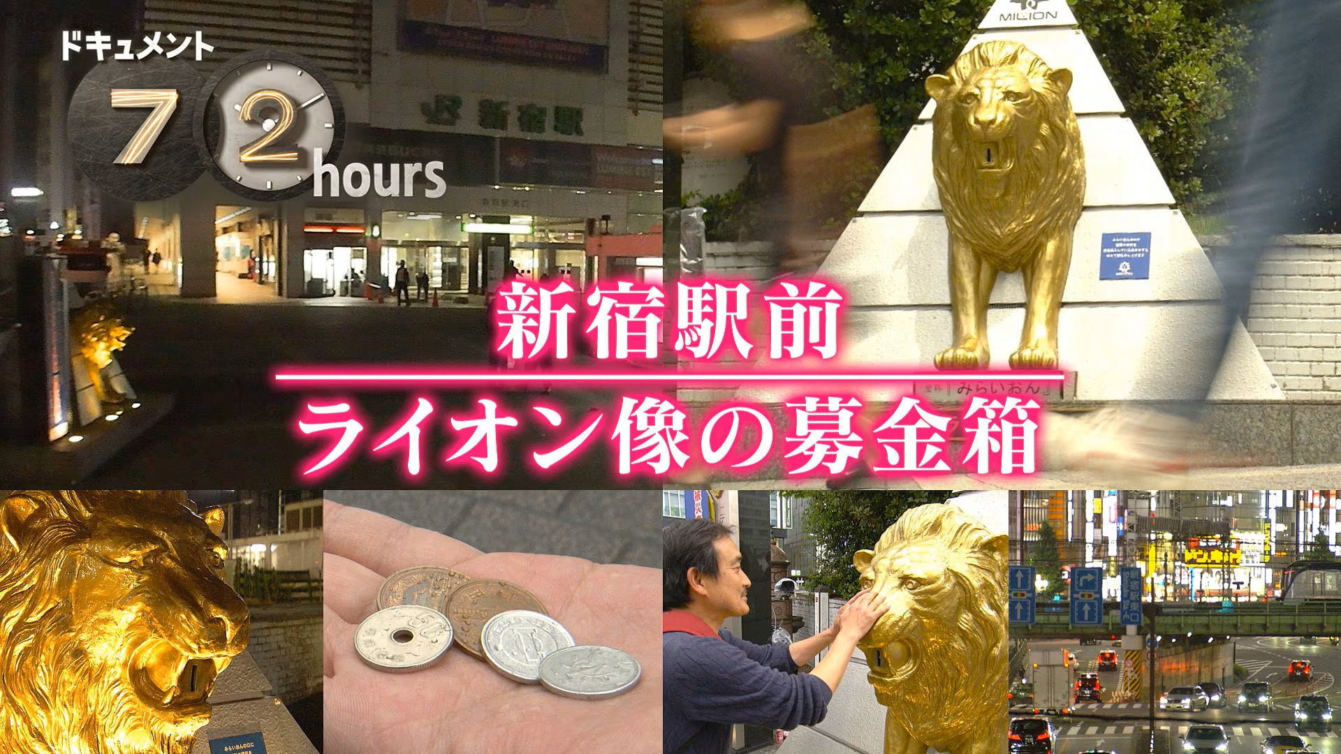 A roaring golden lion statue outside Shinjuku Station is a donation box for disaster relief and youth support. Many walk past while others offer small kindnesses. Who donates over 72 hours, and why?