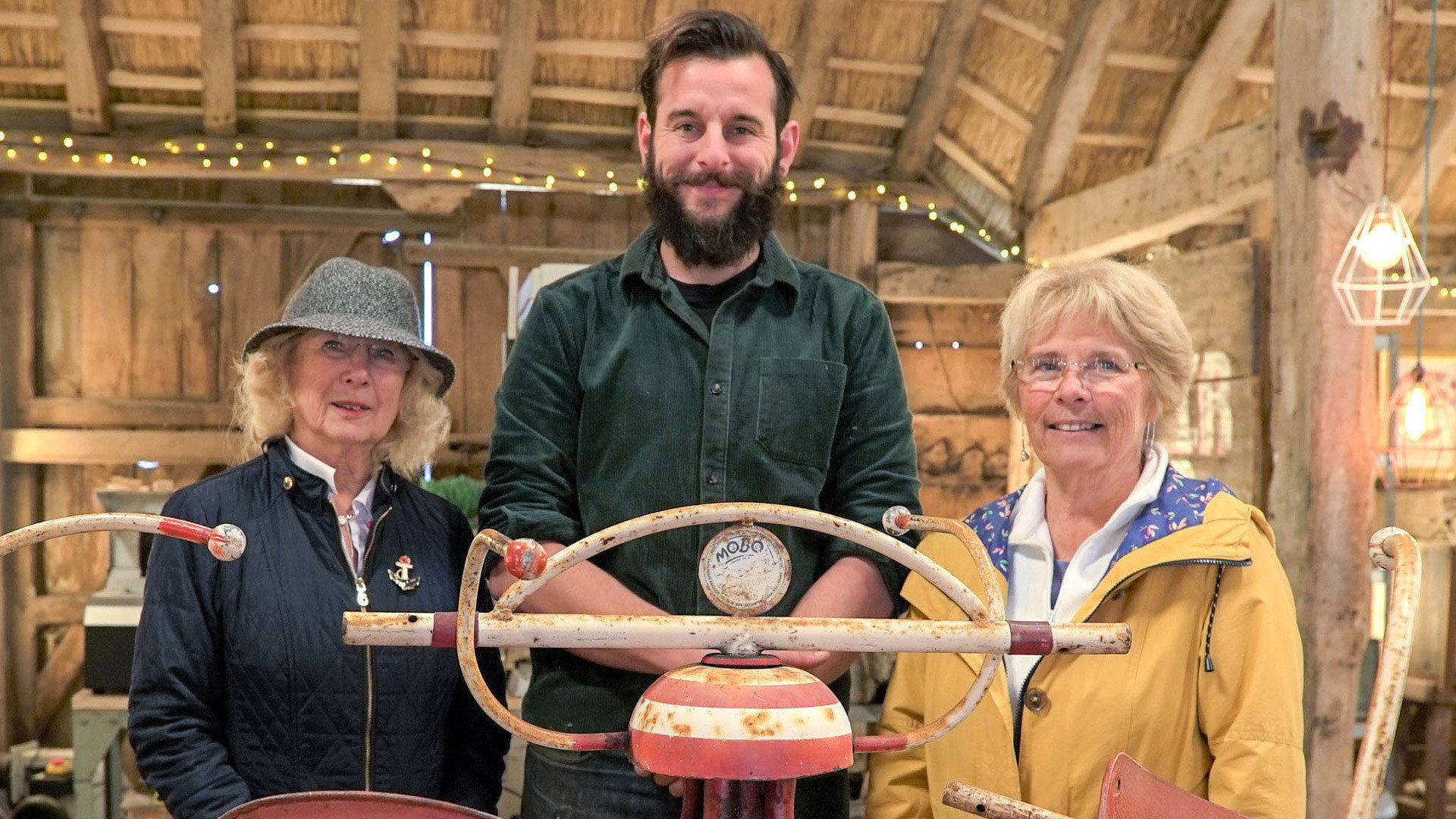 Jay Blades and the team take on a dented trumpet, a decorative belt awarded to a Victorian sporting hero and a metal roundabout. The first visitors to the barn are Cassie and Sue Day from Swindon have a very battered old trumpet for Pete Woods to repair and restore. It used to be used every New Year's Eve by Sue's dad (Cassie's gran-dad) to play Auld Lang Syne up and down the street. The next to enter the barn are Marilyn Rossel and her sister Margot from Eastbourne have brought in an old metal roundabout for Dominic Chinea to sort out. The last visitor today is Gil Lee from Burnley who has brought in a champion speed walker's belt for Brenton West and Suzie Fletcher.