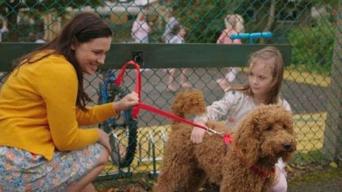 When Jess takes Evie for her first school visit, Waffle goes along too - on the condition that he doesn't sing. He tries his best to behave, but it's hard for a Wonder Dog! On their walk to school, Jess and Evie bump into Connie Lester and her daughter Ruby. Ruby reveals that she will also be starting at Sommersby School too, in the year above Evie. Ruby enjoys stroking Waffle and tells Evie that she loves animals. She has a pet dog of her own, Jelly, a yellow labrador. Waffle introduces himself to Jelly, but decides Jelly is a grumpy dog. Meanwhile, there's a For Sale sign in Mrs Hobbs's front garden. Mrs Hobbs and George are moving house and leaving Maple Close forever.