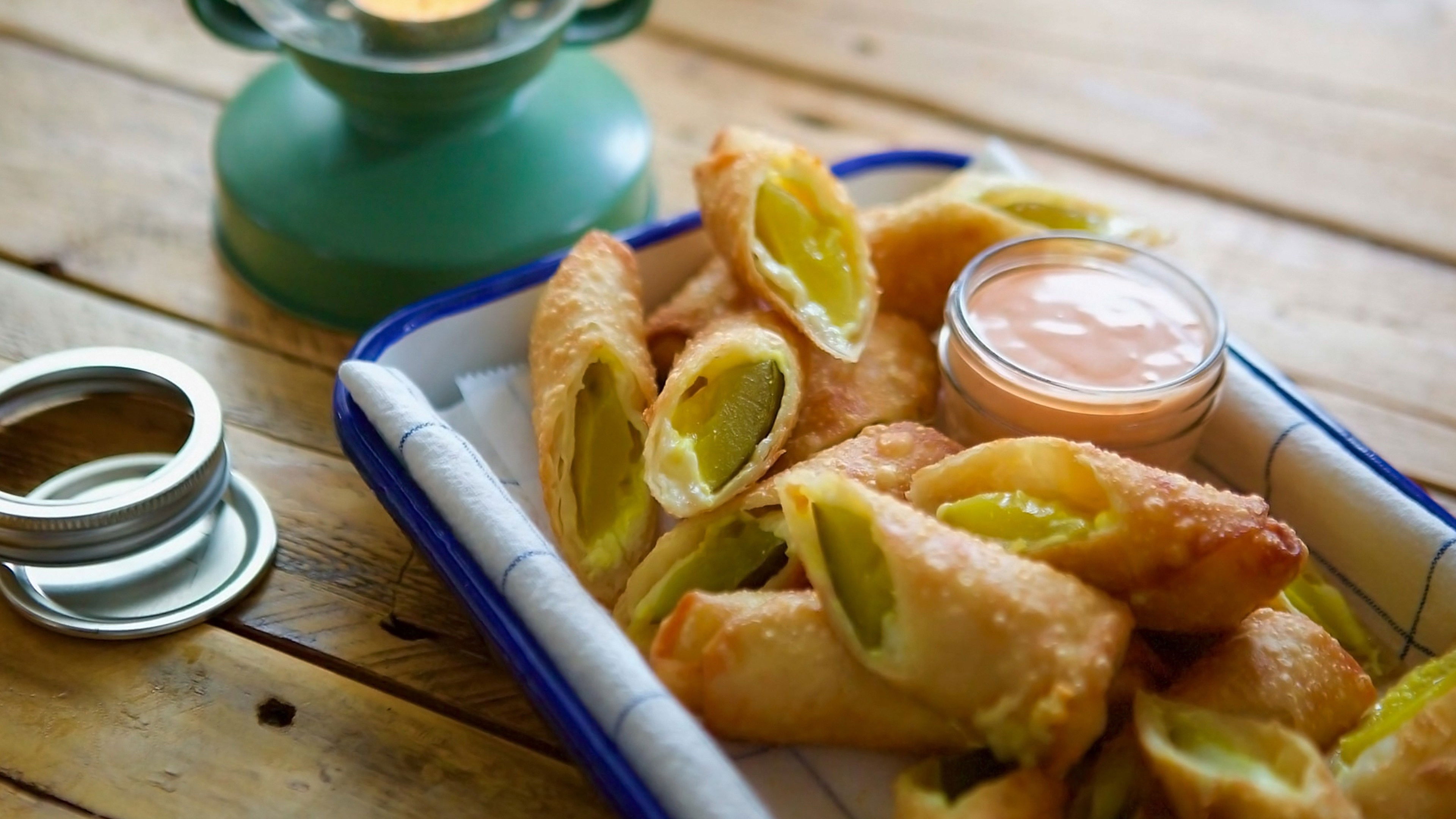 Molly's blogging friends are flying in to help her pick apples on the farm; she makes a campfire supper that includes fried cheesy pickles, a butternut, bacon and apple hot dish, creamed spinach with crispy cheese and creamy butterscotch pudding.