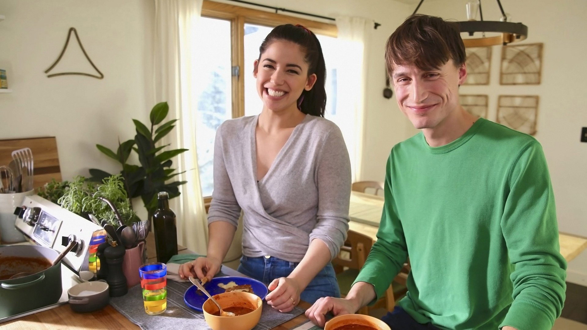 Molly Yeh serves up a tasty lunch before her husband's trombone practice. On the menu are a hearty tomato squash soup and labneh grilled cheese.