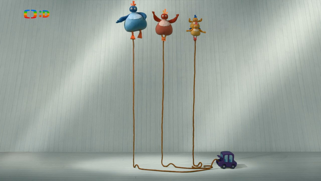 The Twirlywoos are balancing on ropes. All is well until Peekaboo pulls the ropes away.