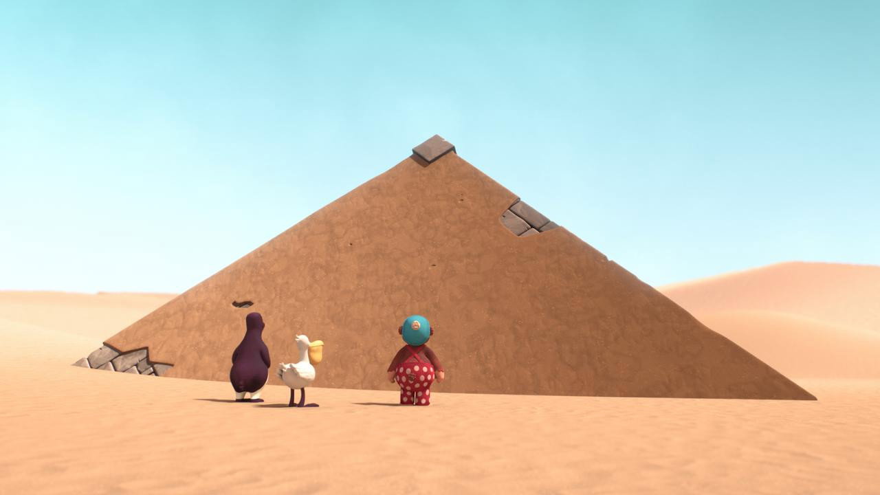 In the middle of the desert, the friends enter a half-sunken building. It's not a pyramid, and the dead mummy inside is a very lively hippopotamus called Nils. Nils has desperately tried to dig for a spring in the basement of the house.