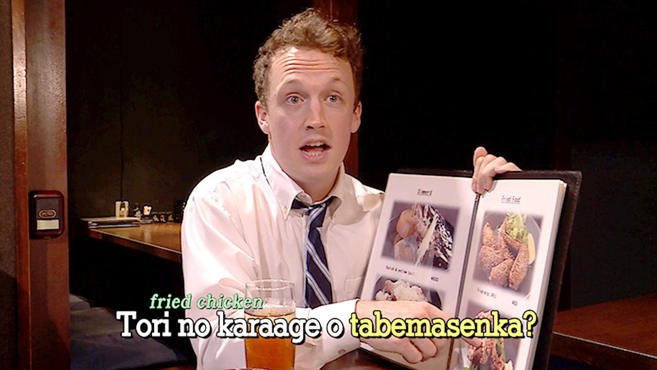 Today we'll learn to make a suggestion to someone by adding "ka" to the negative form of a verb. In the video, a man wants to invite that he and his colleagues all go to dinner together. "Ikimasu" means "go". The negative form of "ikimasu" is "ikimasen". Let's check out the video to see how it's used.