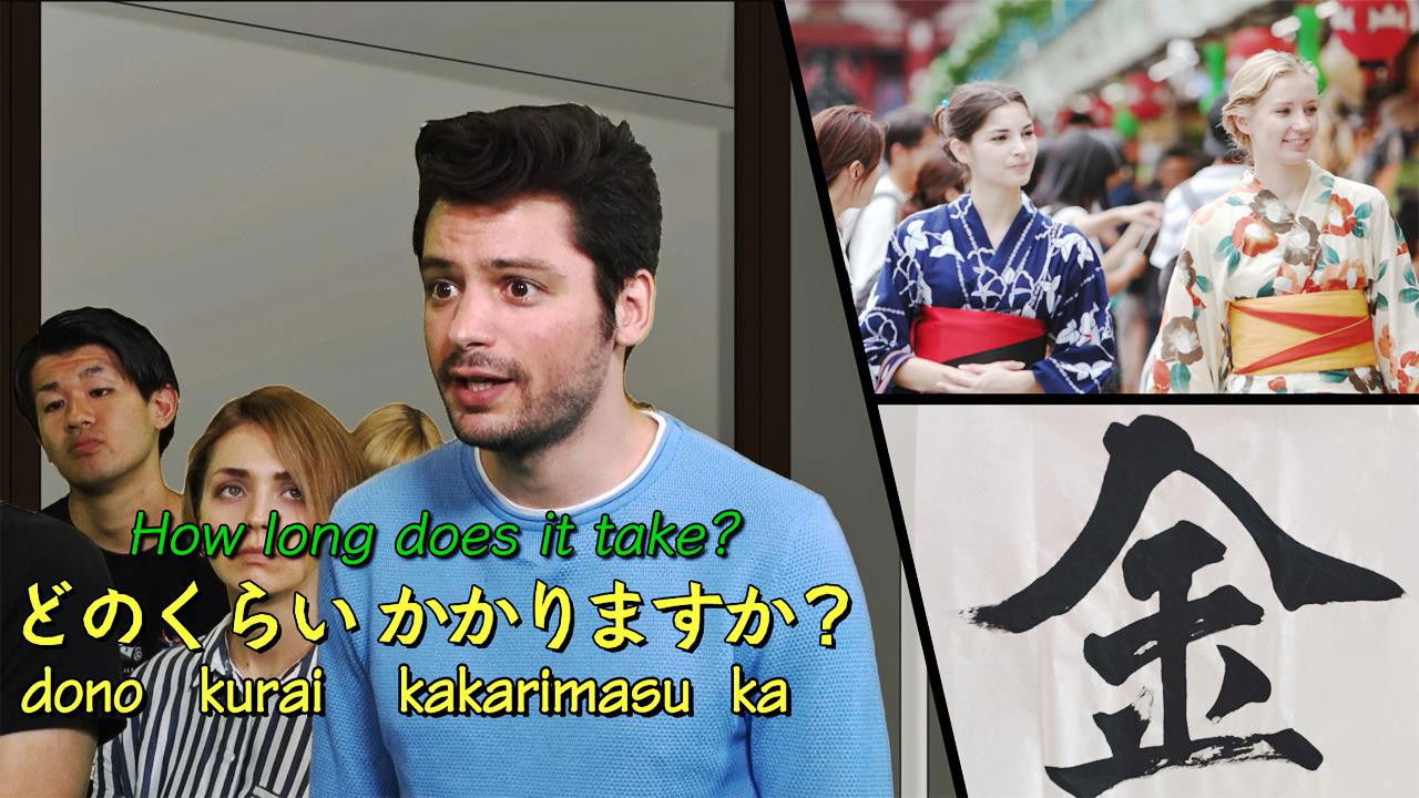 In this episode, we'll learn the question "Dono kurai kakarimasu ka?" We use this to ask how much time or money something takes. We'll also learn about 3 kanji: 金 (money), 近 (near) and 遠 (far).