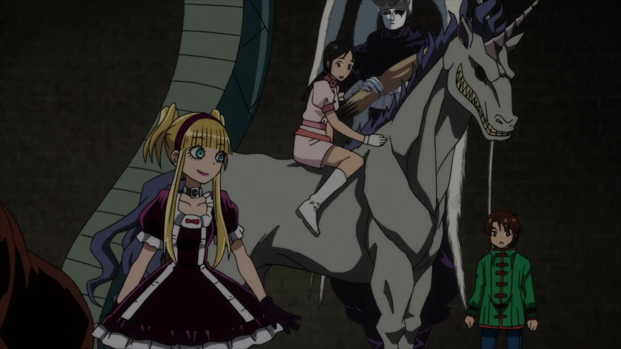 Masaru fights Faceless’s automata with Harlequin. Lise and Colombine battle to stop Faceless’s rocket. Faceless tries to transfer his consciousness into Masaru but fails due to Masaru’s resistance.