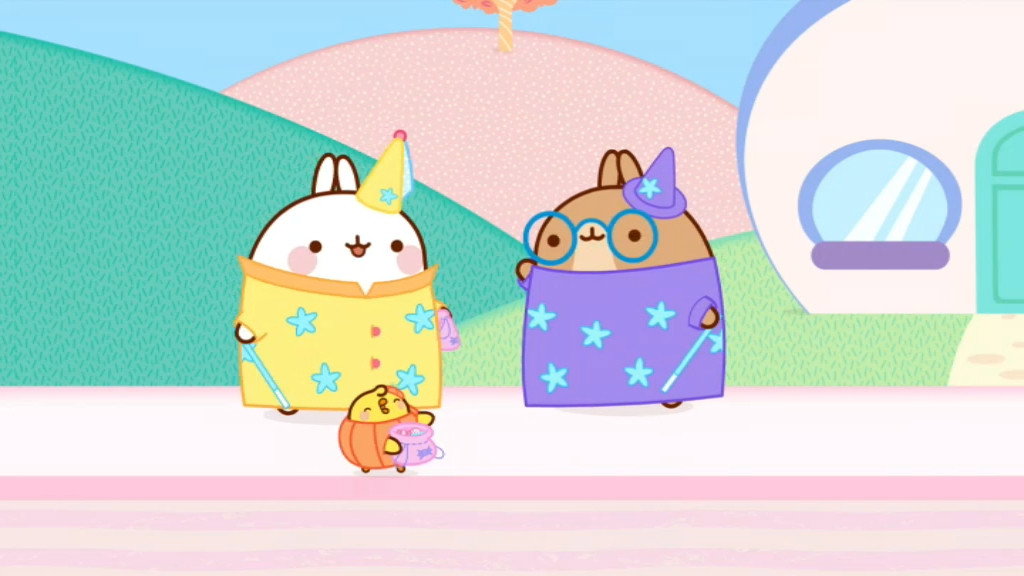It's decided, for Halloween, Molang will dress up as a wizard and Piu Piu as a pumpkin! When they go trick or treating, Molang bumps into a real wizard, and neither realises their wands have been swapped.