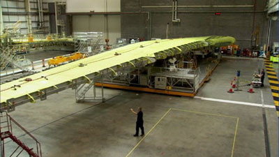 Britain is one of the world leaders in aerospace manufacturing and there's one part of a plane the UK is reputed to make better than anyone else - the wings. It's often said that no matter what else is done and what innovations are introduced, the wing defines the aircraft. The A380 wing is the largest ever produced for a civil airliner, at 17.7 metres from front to back and 36.3 metres from fuselage to wingtip. The maximum length of metal in a single wing is 46 metres and the result is an aircraft with a tip-to-tip wingspan of 79.8 metres, making the A380 the world's biggest passenger aircraft. The film follows some of the people who work at the two main Airbus factories in the UK. In Filton, near Bristol (which has manufactured aircraft for almost 100 years, including Concorde) we meet engineers and designers at the company's cutting-edge research and development facility, and in Broughton, in North Wales, one of Europe's biggest factories, we meet the people who actually build the massive wing.
