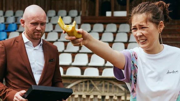 In this episode, the contestants must complete 11 tasks with fruits and vegetables, do something uncharacteristic with 200 kroner, draw the biggest bike, subtly deliver a five word instruction to Mark, and name celebrities in time with some music.