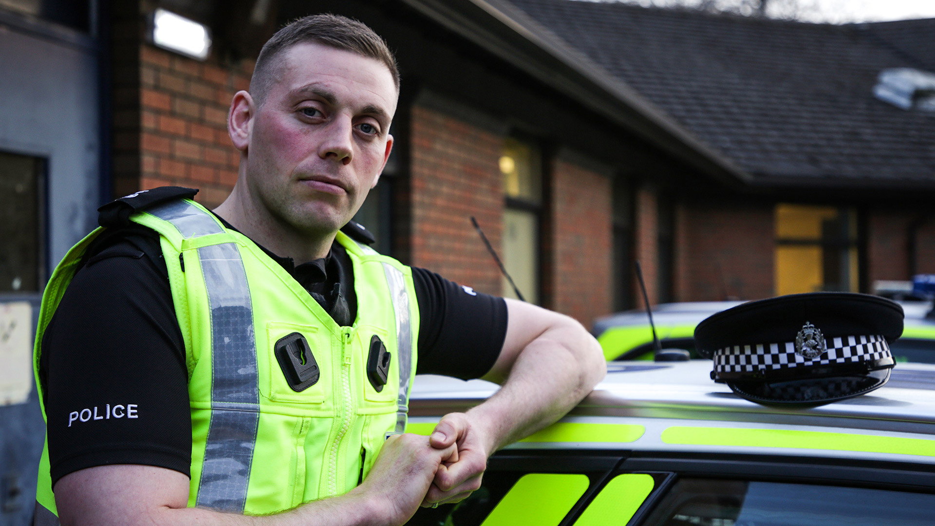 A police officer is thrown 100 feet in the air when joyriders plough into him at 50 mph.
