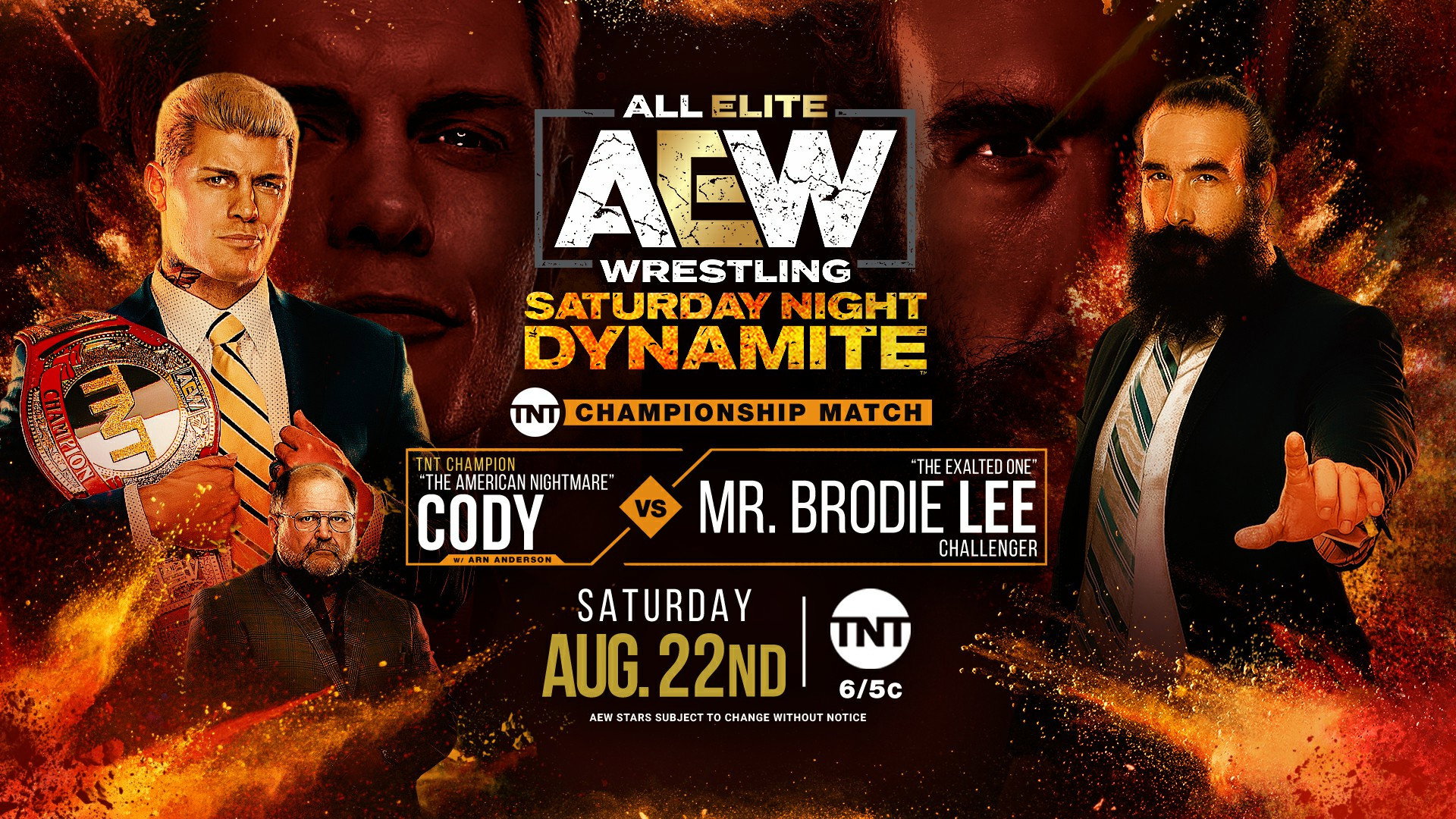 It's Saturday Night Dynamite with TNT Champion Cody vs. Mr. Brodie Lee. Finals of the Women's Tag Team Cup. Darby Allin in action. Young Bucks & Kenny Omega face the Dark Order. Top Tag Team Champion Contender FTR vs. Private Party.