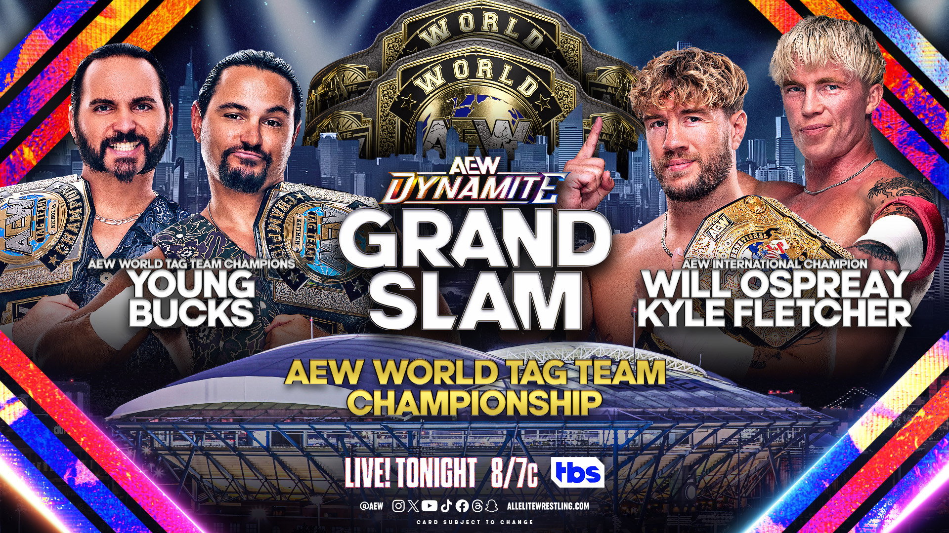 DYNAMITE Grand Slam live from Arthur Ashe Stadium. Nigel McGuinness hopes to challenge Bryan Danielson for the AEW World Championship. Young Bucks defend the World Tag Team Championship against Will Ospreay & Kyle Fletcher. Yuka Sakazaki challenges Women's World Champion Mariah May. Jon Moxley vs Darby Allin.
